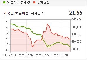 시가총액 13조4,036억원으로 코스피 21위를 기록하고 있으며, 외국인소진율은 21.55% 입니다. 2020년 6월 기준, PBR 0.56배, BPS 338,755원이며, 배당수익률(2019.12)은 2.62% 입니다.