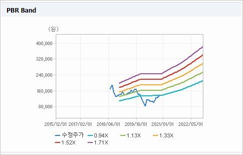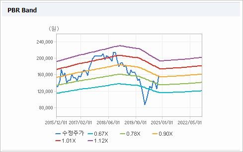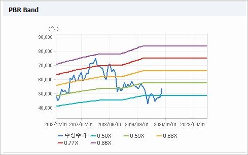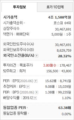 시가총액은 4조1,588억원으로 코스피 64위를 기록하고 있으며, 외국인소진율은 28.32% 입니다. 2020년 6월 기준, PER 15.62배, PBR 1.38배이며, 배당수익률(2019.12)은 1.1% 입니다.