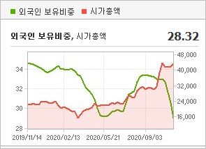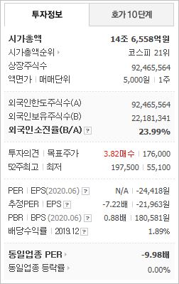 시가총액은 14조6,558억원으로 코스피 21위를 기록하고 있으며, 외국인소진율은 23.99% 입니다. 2020년 6월 기준, PBR 0.88배, BPS 180.581원이며, 배당수익률(2019.12)은 1.89% 입니다. 석유화학 관련주