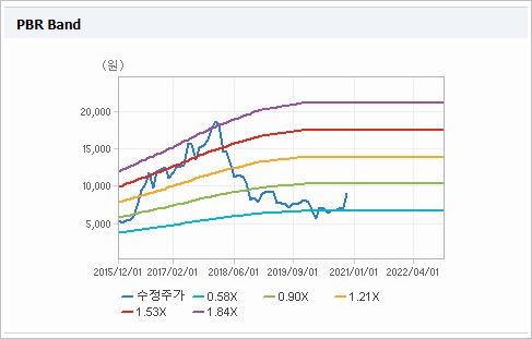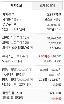 시가총액 2,877억원으로 코스피 410위를 기록하고 있으며, 외국인소진율은 16.24% 입니다. 2020년 6월 기준, PER 8.7배, PBR 0.76배이며, 배당수익률(2019.12)은 3.9% 입니다.