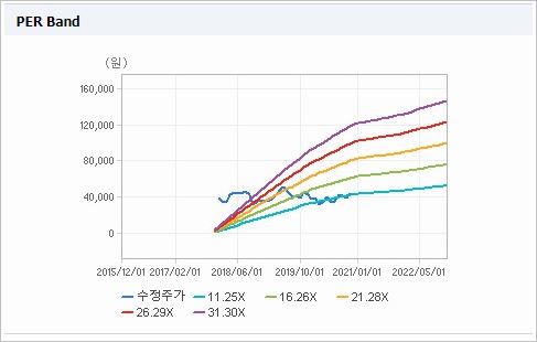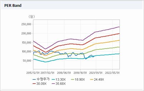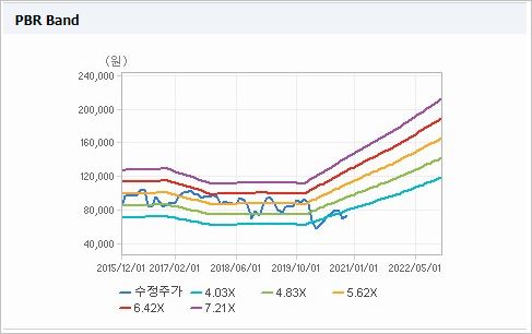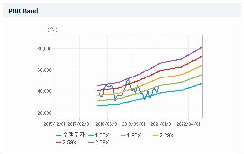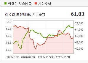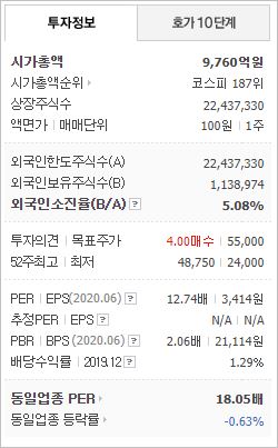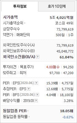 시가총액 5조4,021억원으로 코스피 49위를 기록하고 있으며, 외국인소진율은 61.04%입니다. 2020년 6월 기준, PER 15.39배, PBR 4.04배이며, 배당수익률(2019.03)은 3.28%입니다.