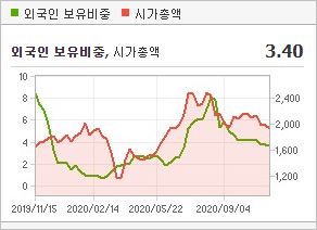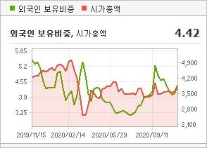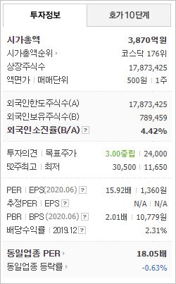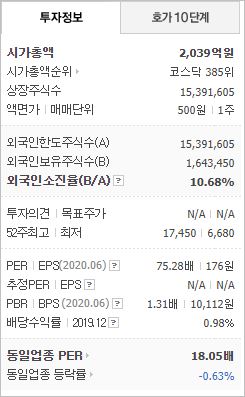 시가총액 2,039억원으로 코스닥 385위를 기록하고 있으며, 외국인소진율은 10.68%입니다. 2020년 6월 기준, PER 75.28배, PBR 1.31배이며, 배당수익률(2019.12)은 0.98% 입니다.